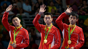 18、(从左到右)男子乒乓团体赛马龙、许昕、张继科、荣获金牌2016-8-18