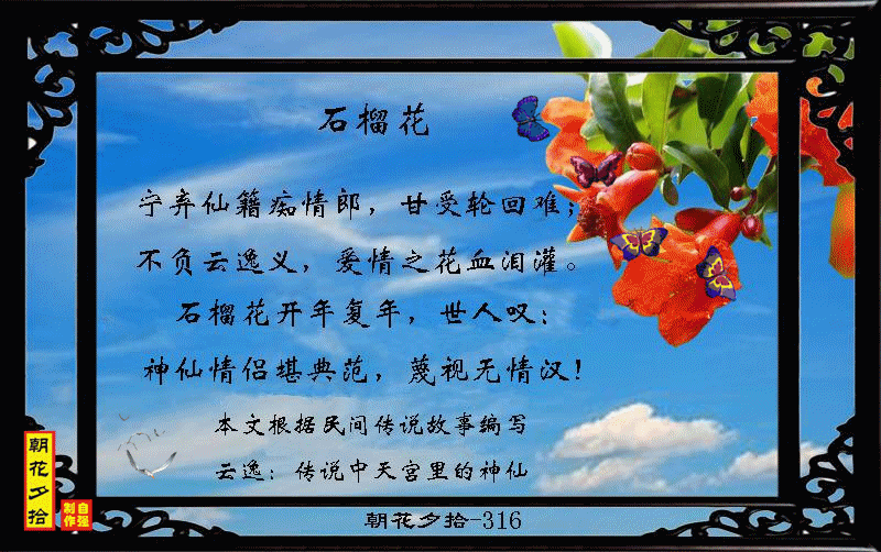 榴花仙子的爱情传奇:这个故事讲述了一位名叫榴花的美丽女子和一位天宫中的神衹“云逸仙君”的爱情故事。为了与榴花长相厮守,云逸仙君放弃了仙籍,并甘愿承受轮回之苦。榴花用自己的血泪浇灌了一株石榴树,并许下誓言,如果他们的爱情能经受住时间的考验,这棵石榴树将年年开花,见证他们的不朽情缘。